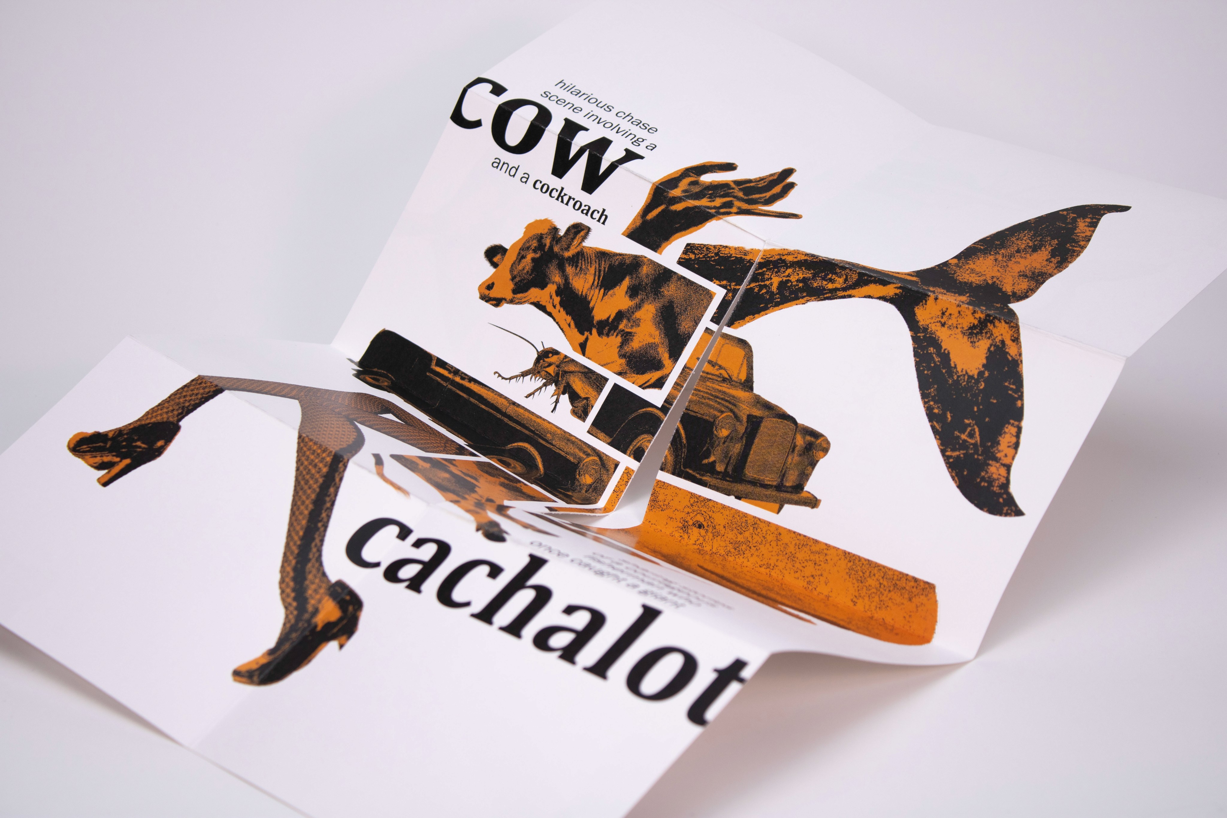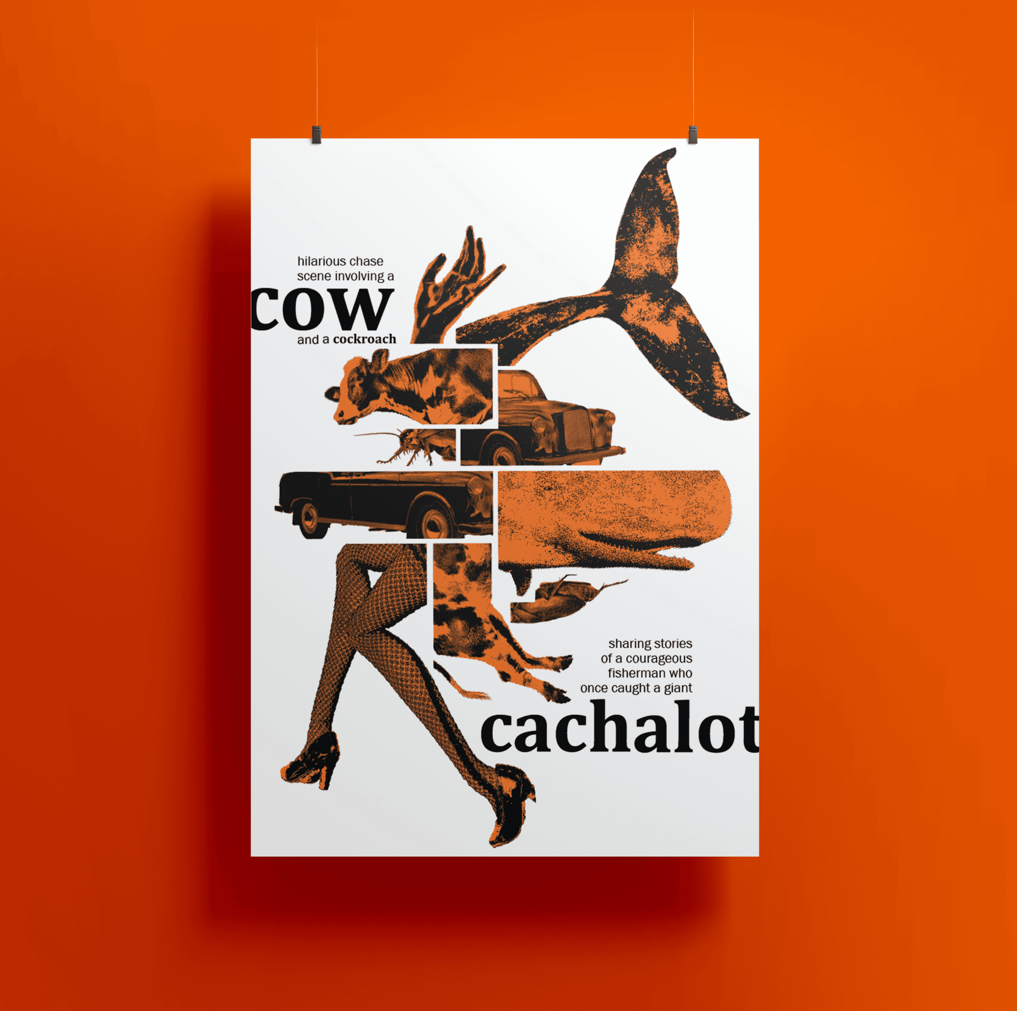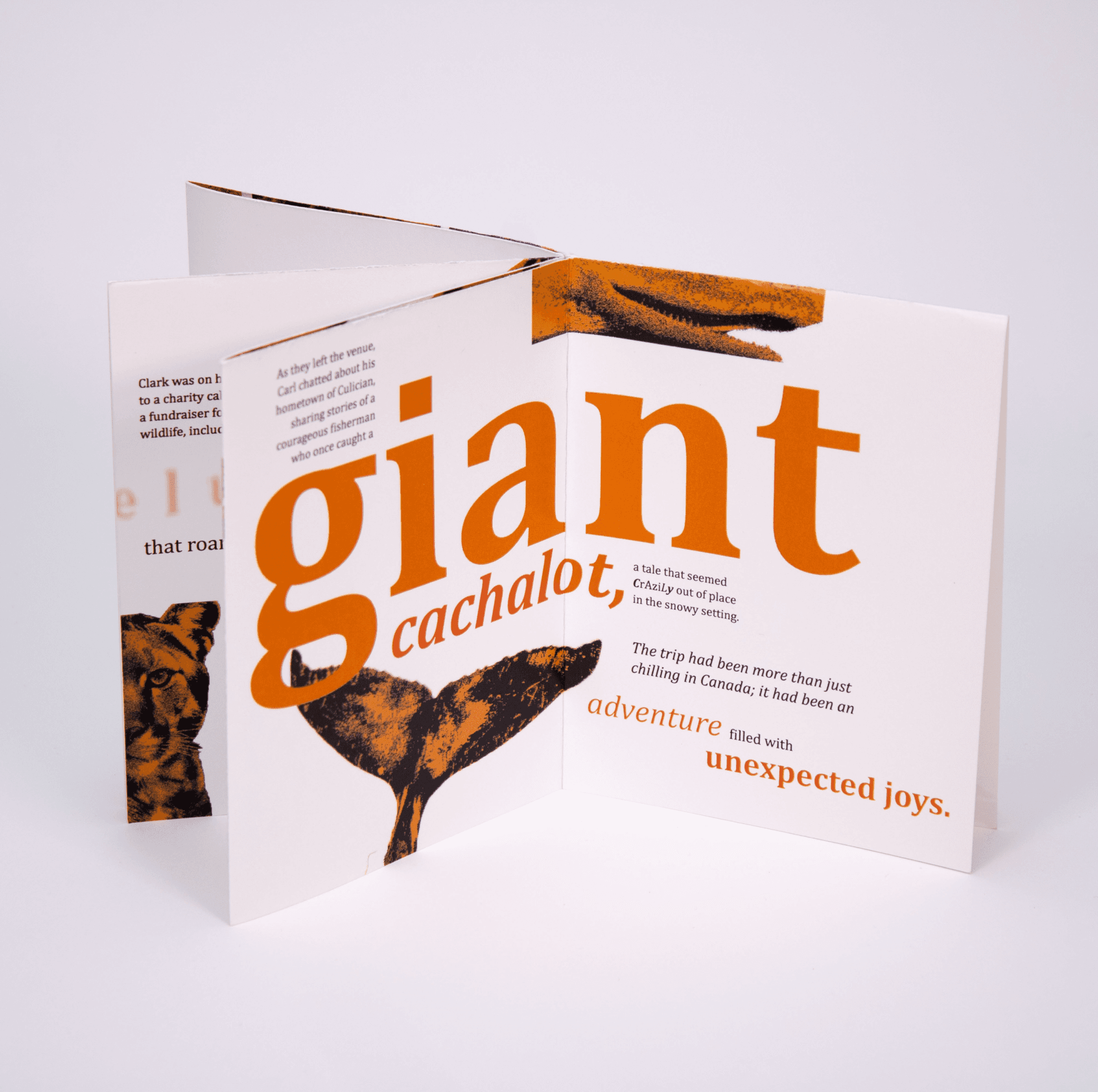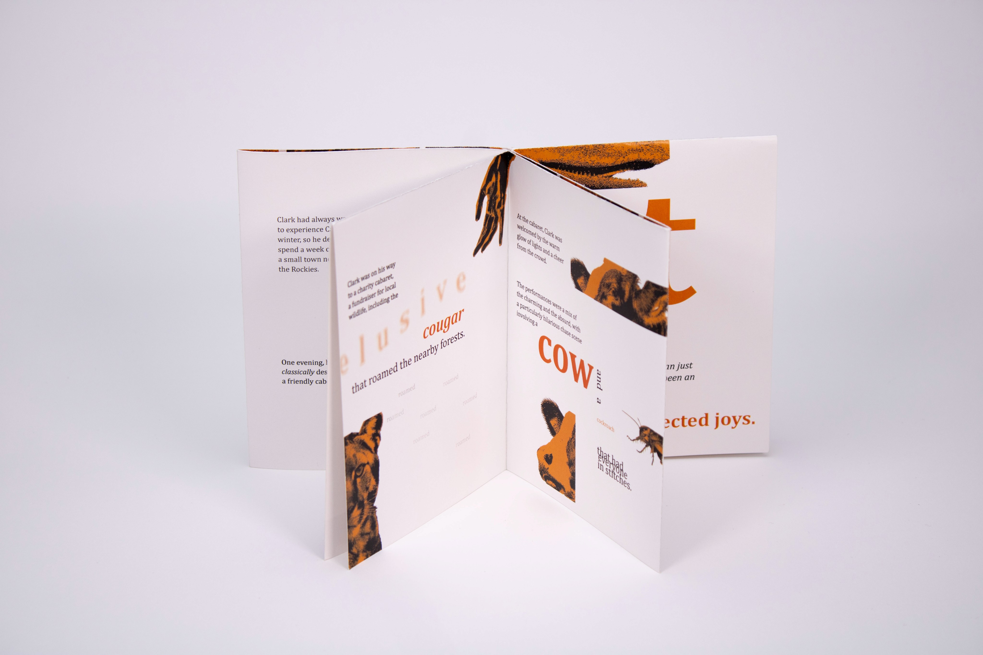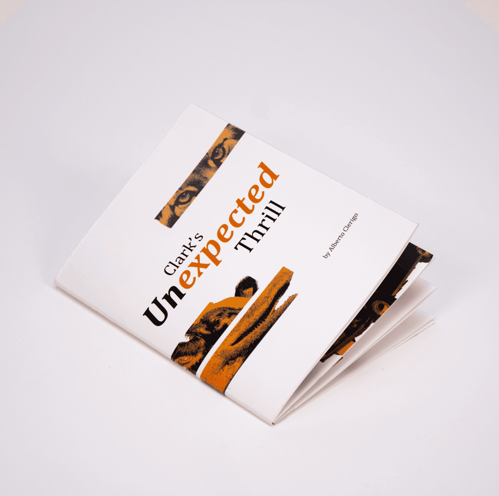 Clark’s Unexpected Thrill is a small folded booklet that experiments with storytelling, typography, and layout. The booklet features four pages with a cut at the top center, allowing it to unfold back into a full-sized poster. Inside, a made-up story generated by AI follows a character named Clark, using mostly words that start with the letter "C." When unfolded, the back side reveals a collage of images and type that highlight moments from the narrative. A bold orange and black color palette ties the piece together, creating strong contrast and energy. This project explores typography through grids, hierarchy, emotional expression, and dynamic composition, with the final poster built using letterpress printing.