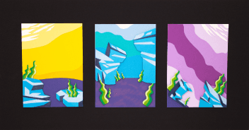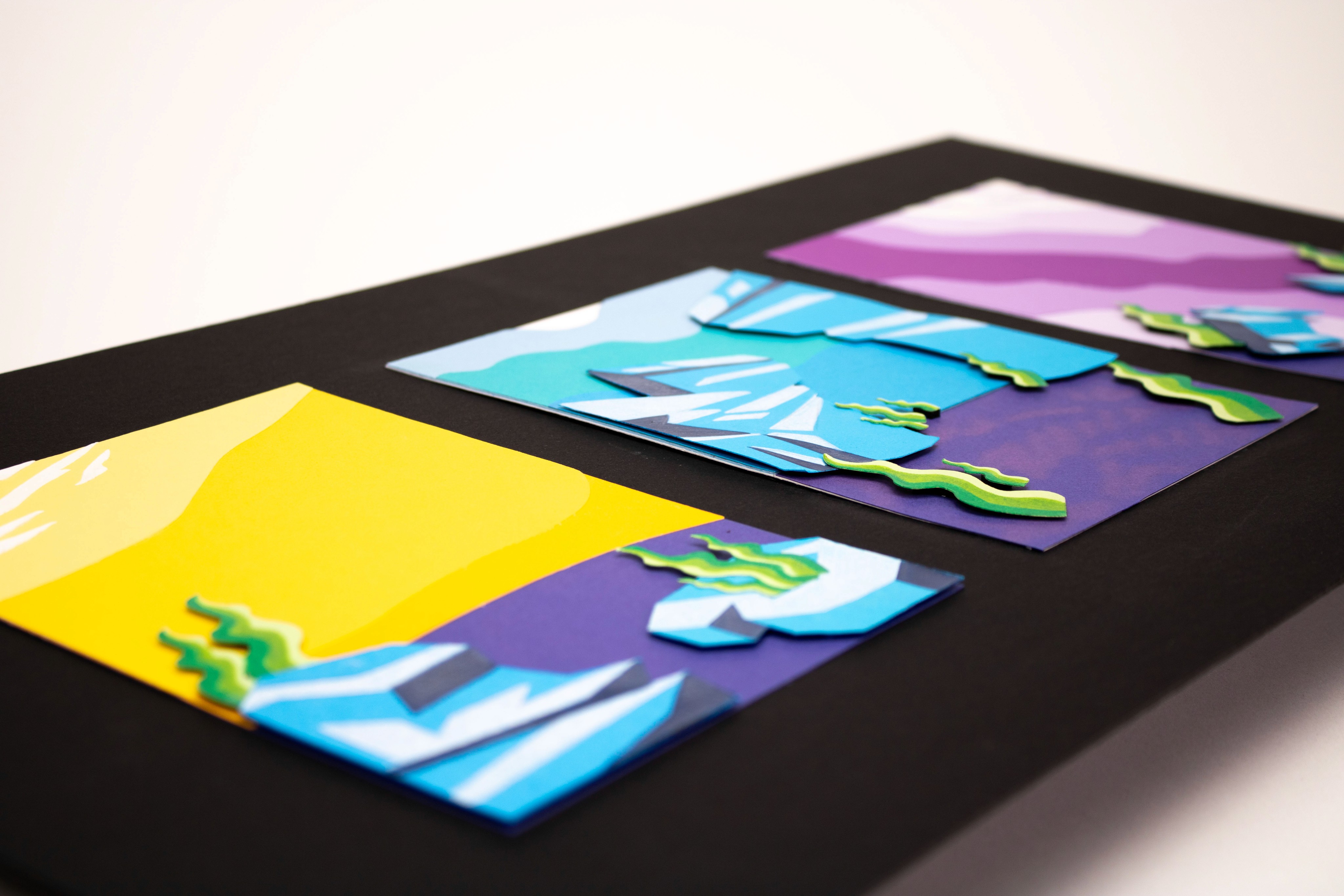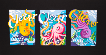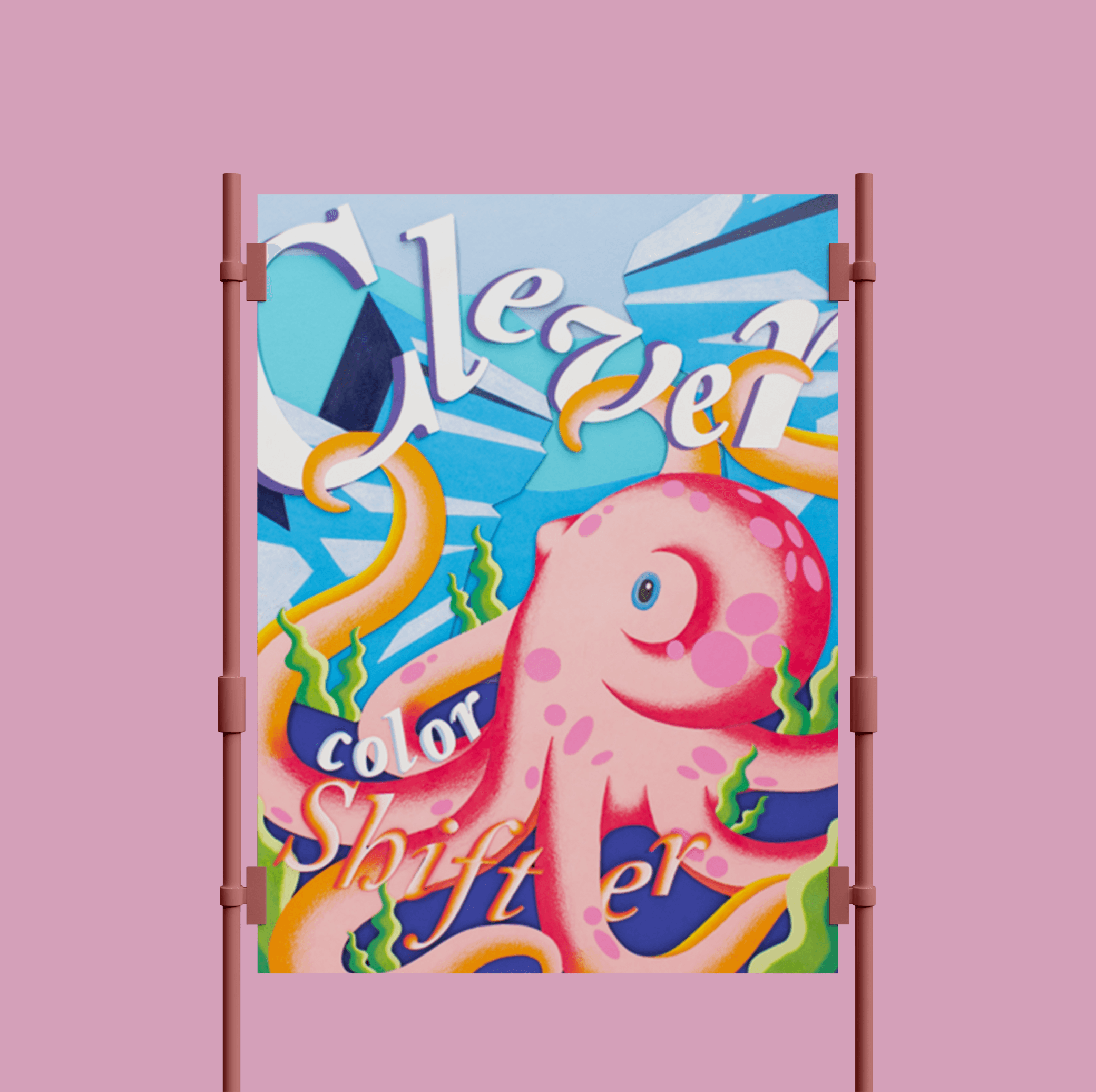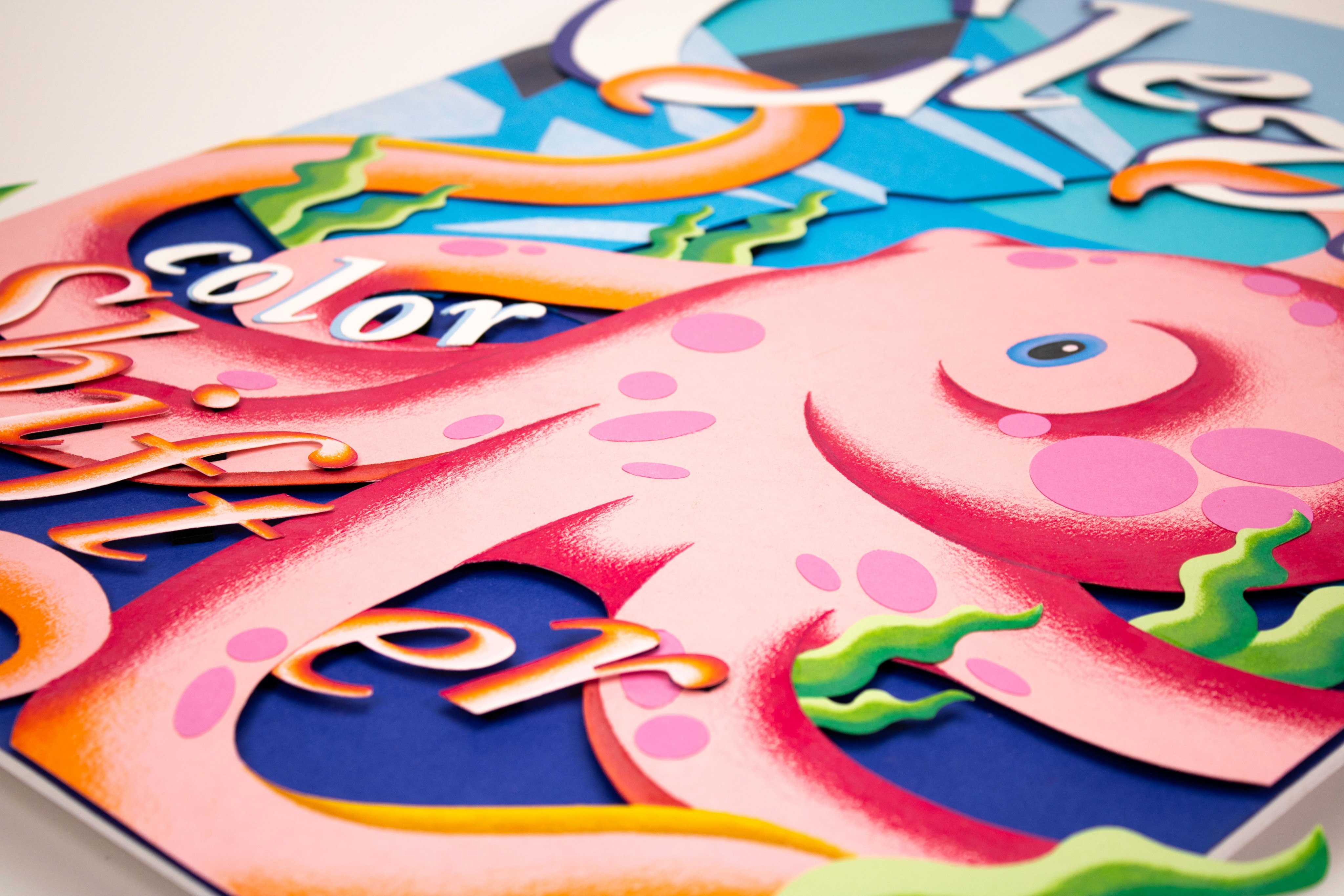 This poster explores Arctic habitat life through the image of an Arctic octopus in its habitat. Bold typography reading "Clever Color Shifter" wraps around the octopus, highlighting its ability to adapt and blend into its surroundings. Colorful pieces of cut paper build the main imagery, while Prismacolor pencils add shading and texture throughout. Foam tape lifts certain pieces off the surface, creating depth and making the composition feel lively and dimensional.